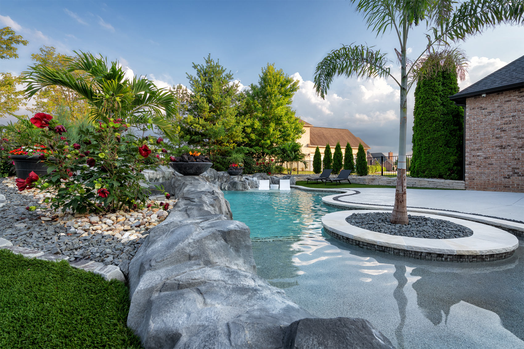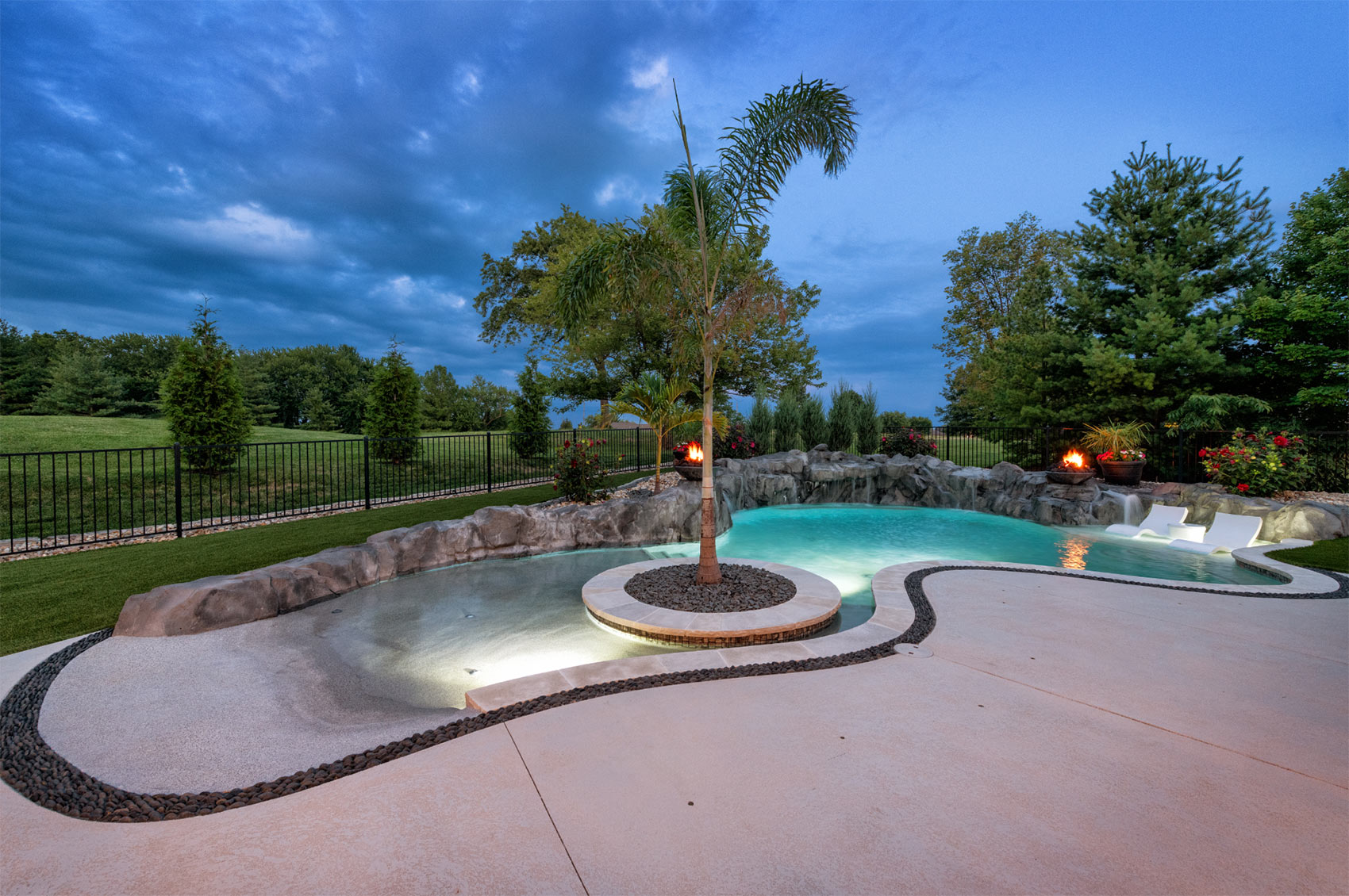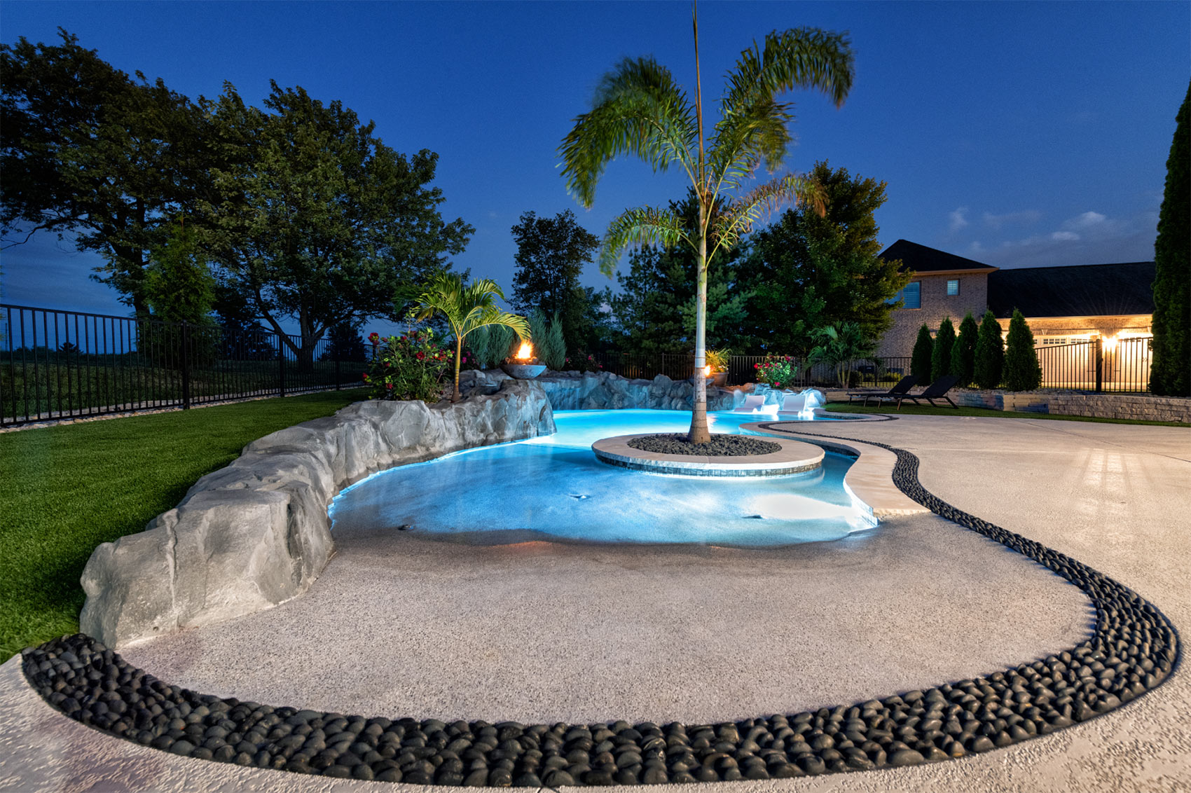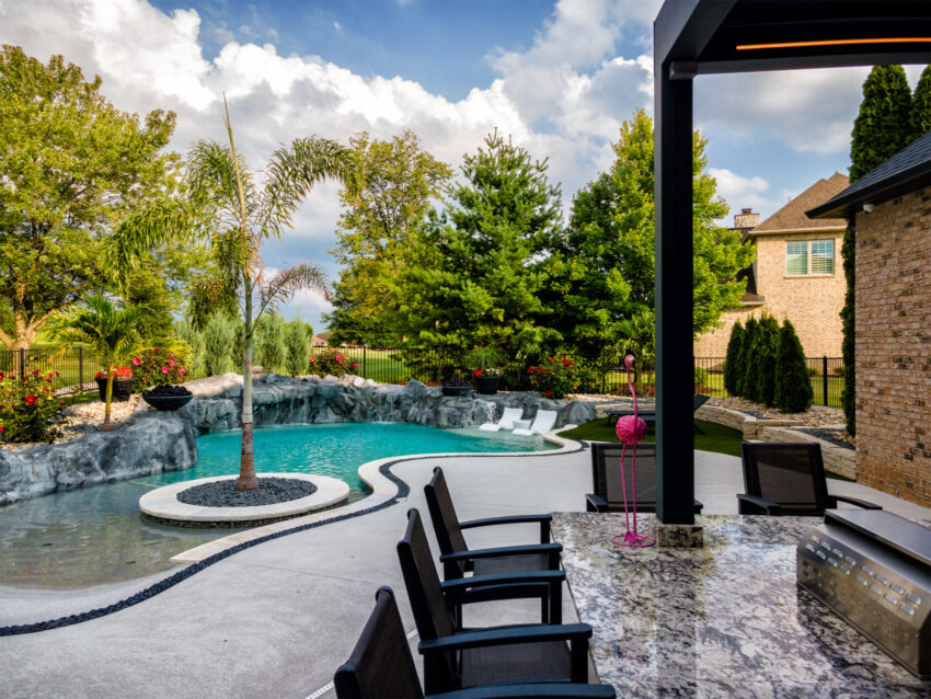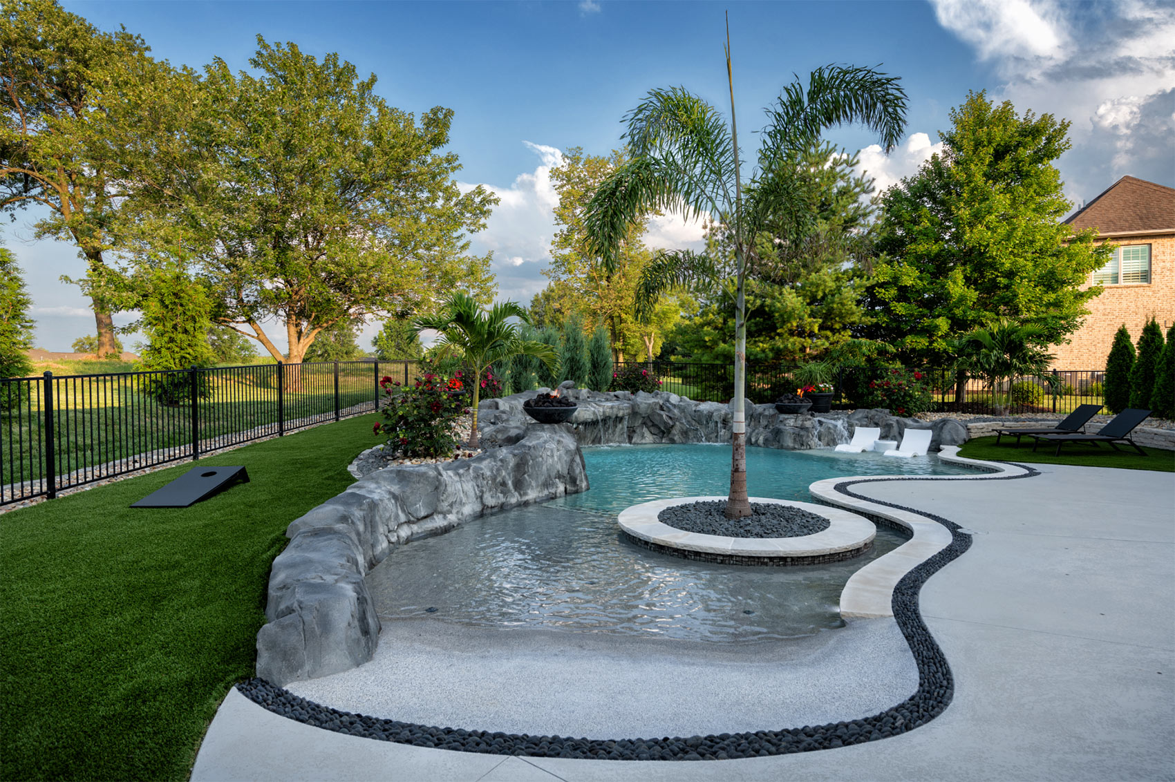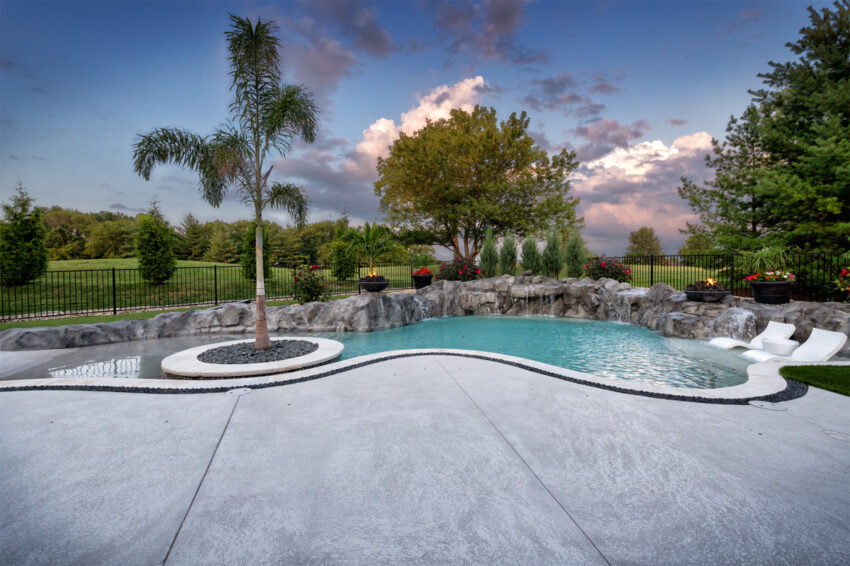 This nature-inspired pool in Caseyville, Illinois features smooth, flowing curves, a beach-style zero-entry, and a Baja sun shelf designed for effortless relaxation. A built-in planter with a palm tree, natural stone tile coping, and a hand-sculpted rock formation along one side create a dramatic focal point, complete with a cascading waterfall and fire bowls. Tropical-inspired landscaping and a covered outdoor kitchen enhance the resort-like atmosphere, while astroturf lawn areas keep the entire backyard beautiful and low-maintenance—delivering the feel of a private tropical retreat right at home.