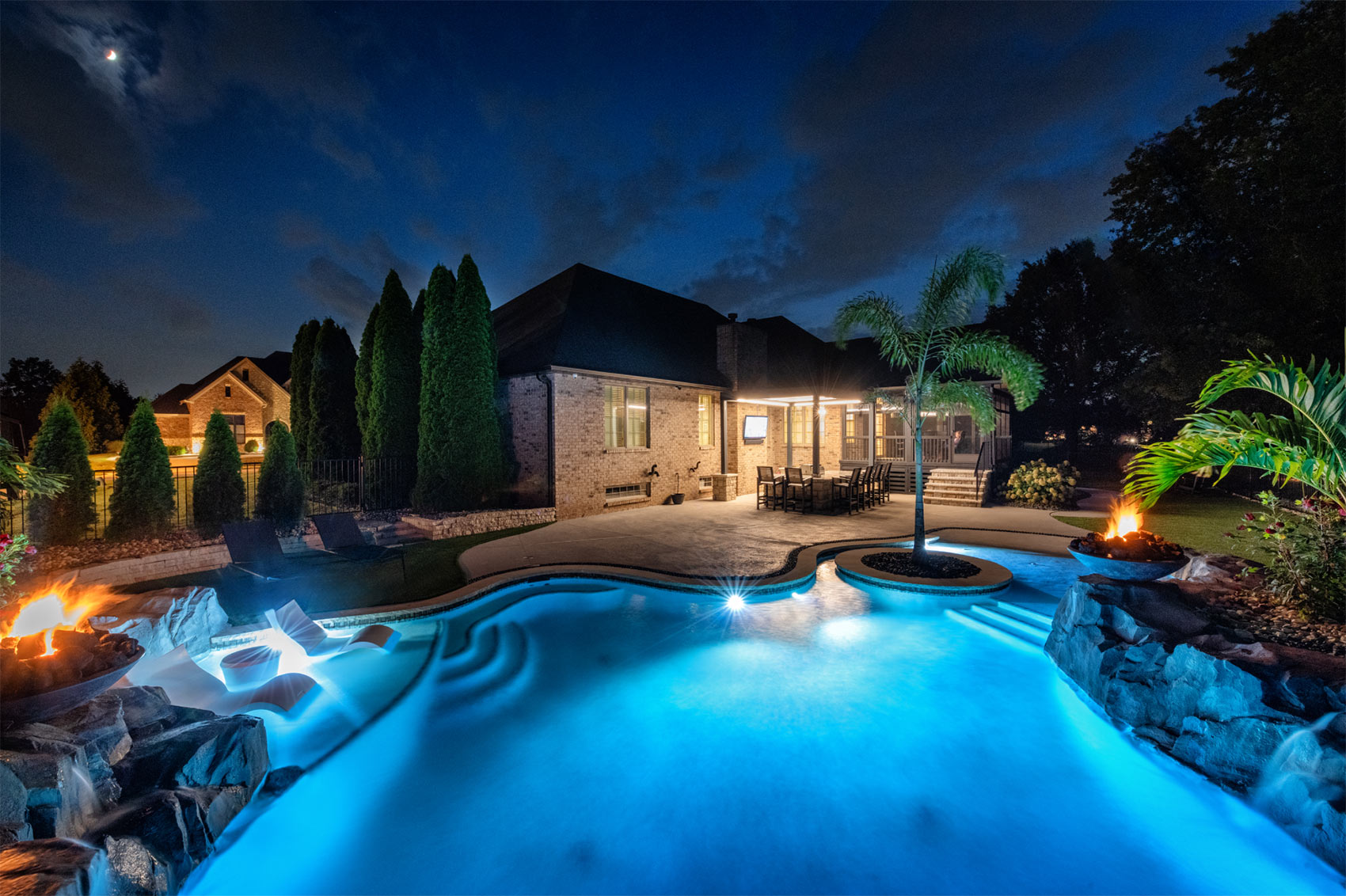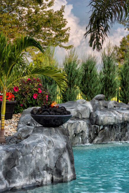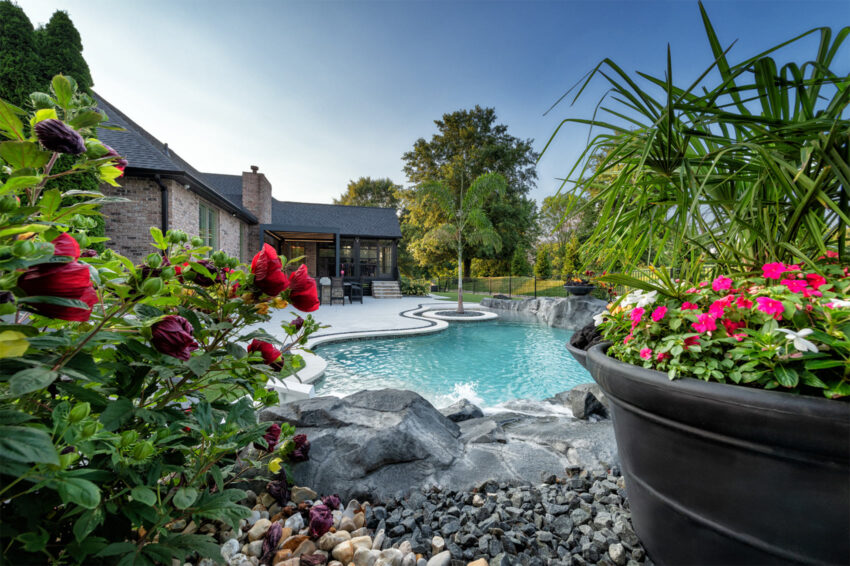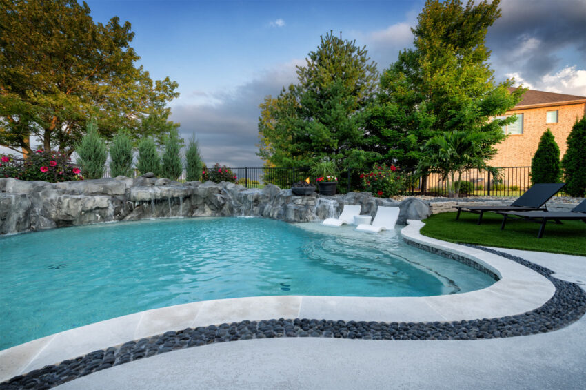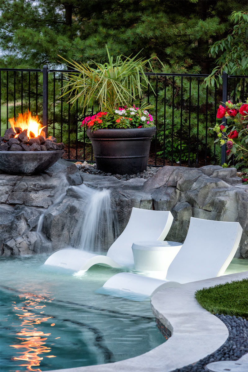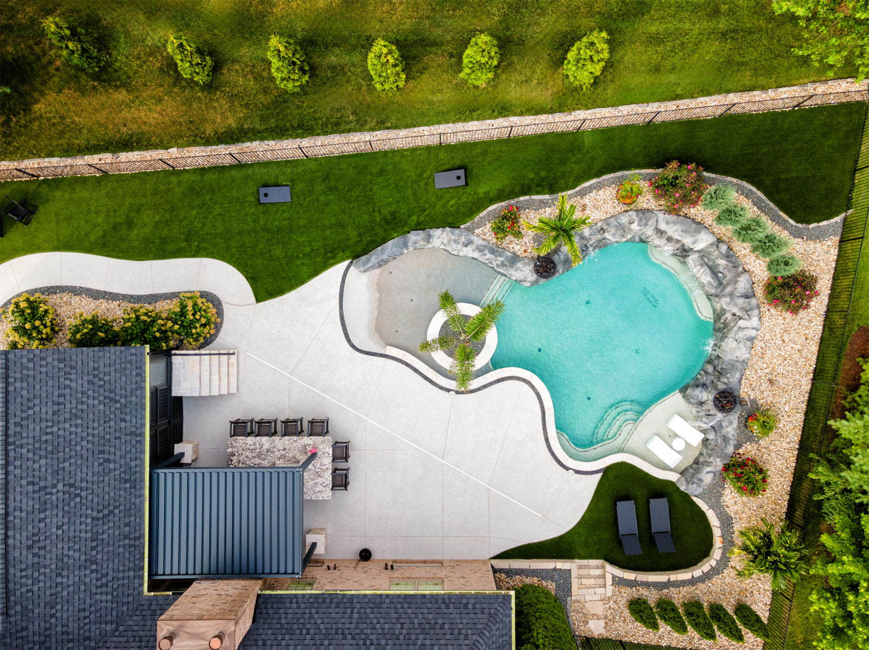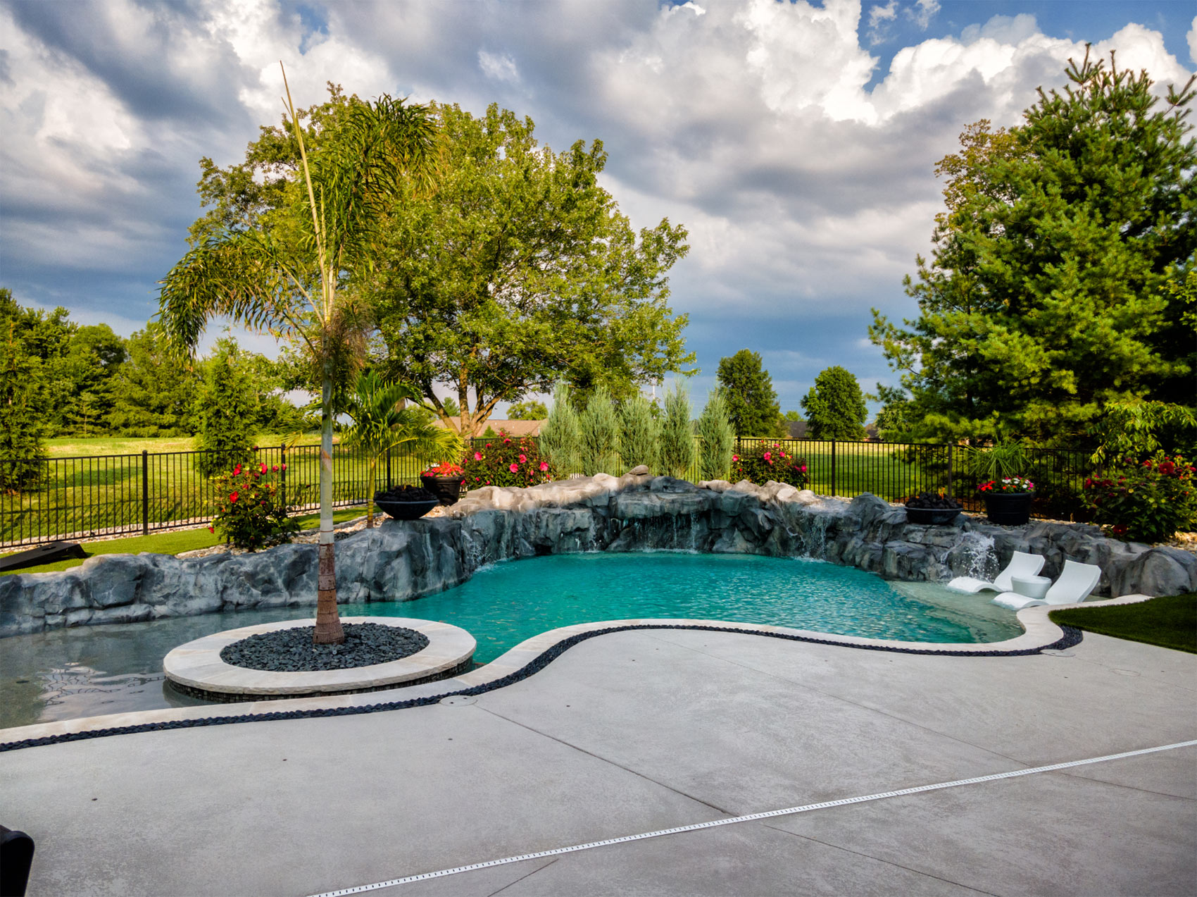This nature-inspired pool in Caseyville, Illinois features smooth, flowing curves, a beach-style zero-entry, and a Baja sun shelf designed for effortless relaxation. A built-in planter with a palm tree, natural stone tile coping, and a hand-sculpted rock formation along one side create a dramatic focal point, complete with a cascading waterfall and fire bowls. Tropical-inspired landscaping and a covered outdoor kitchen enhance the resort-like atmosphere, while astroturf lawn areas keep the entire backyard beautiful and low-maintenance—delivering the feel of a private tropical retreat right at home.