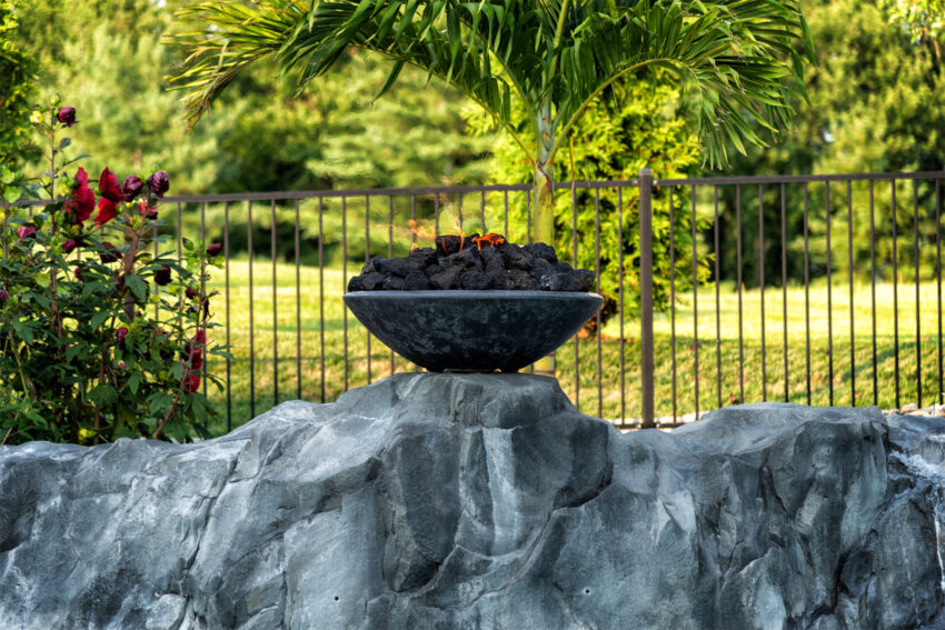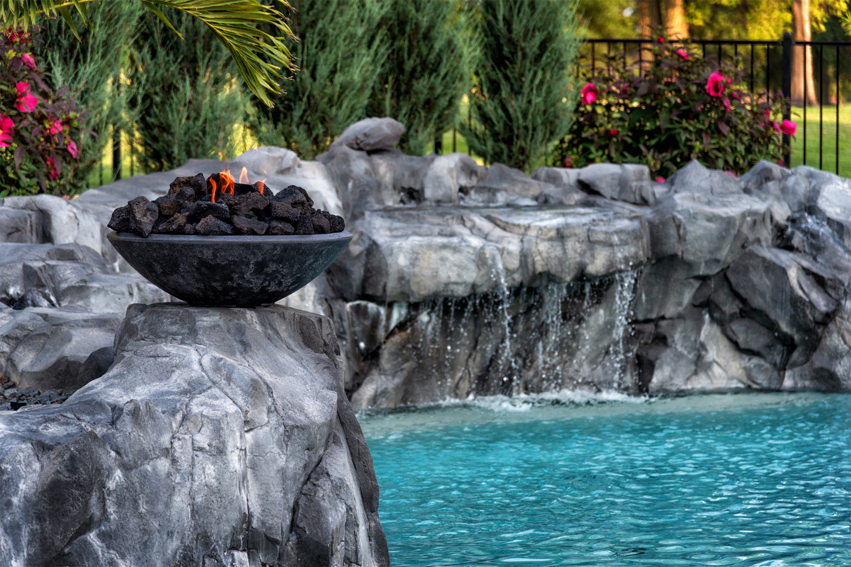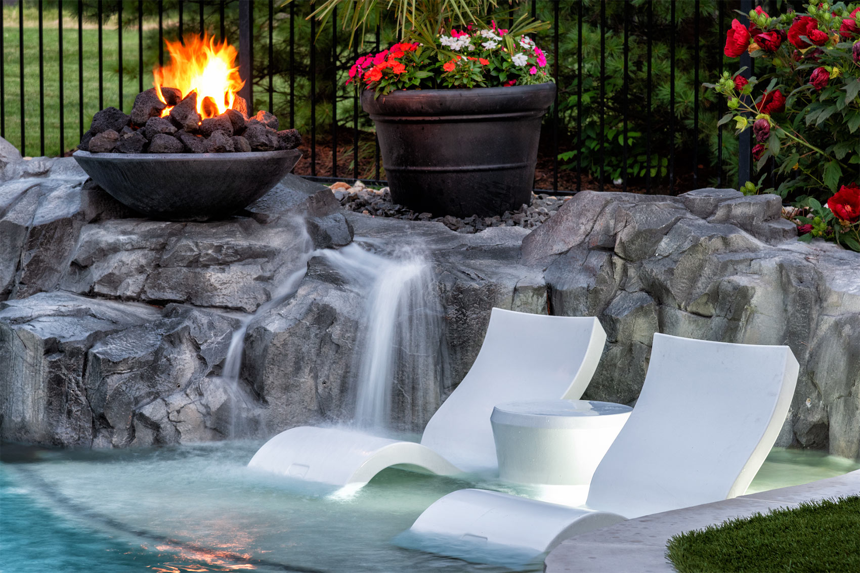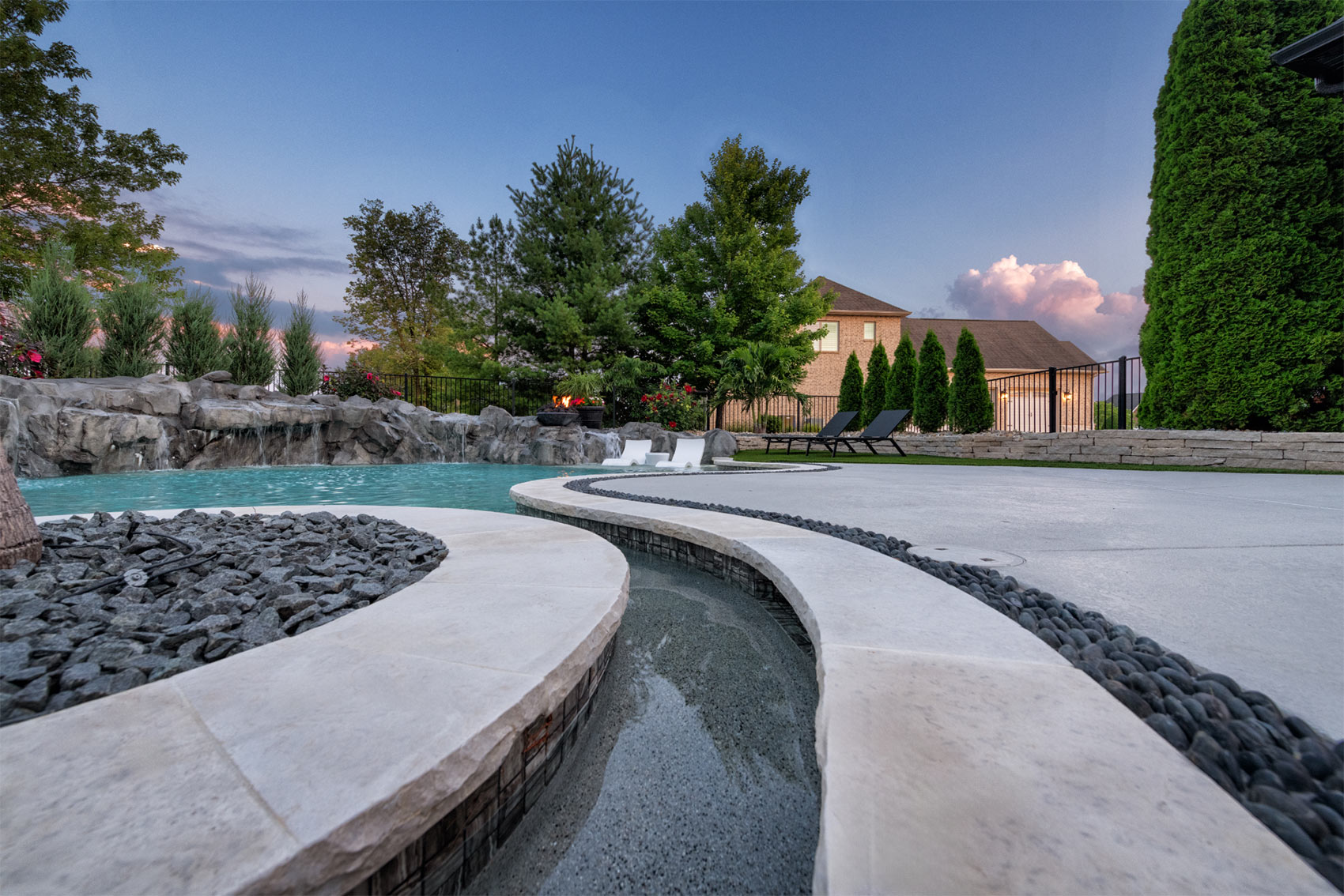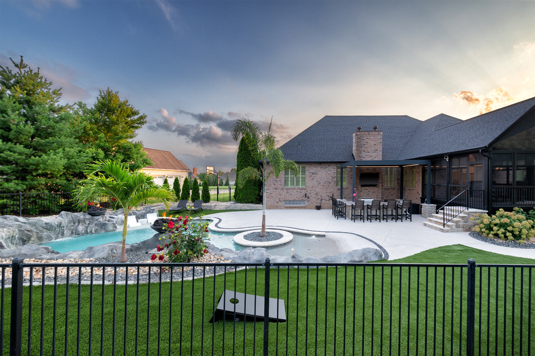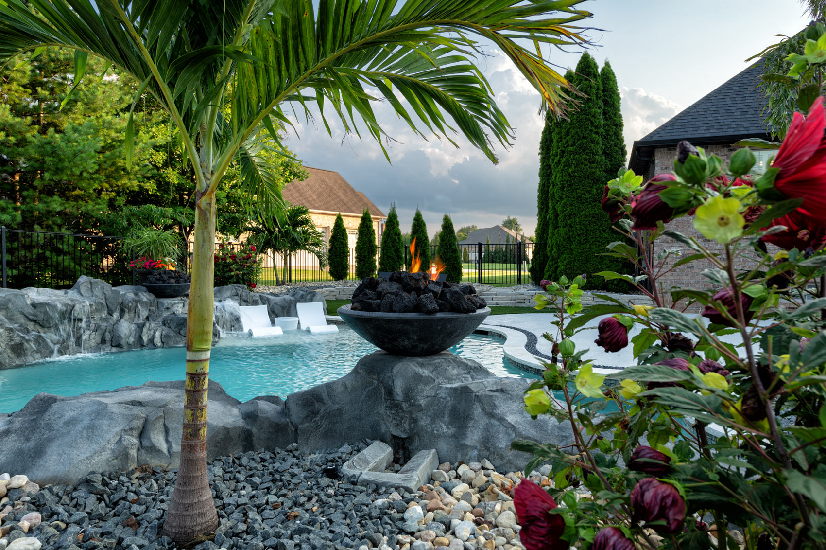 This nature-inspired pool in Caseyville, Illinois features smooth, flowing curves, a beach-style zero-entry, and a Baja sun shelf designed for effortless relaxation. A built-in planter with a palm tree, natural stone tile coping, and a hand-sculpted rock formation along one side create a dramatic focal point, complete with a cascading waterfall and fire bowls. Tropical-inspired landscaping and a covered outdoor kitchen enhance the resort-like atmosphere, while astroturf lawn areas keep the entire backyard beautiful and low-maintenance—delivering the feel of a private tropical retreat right at home.